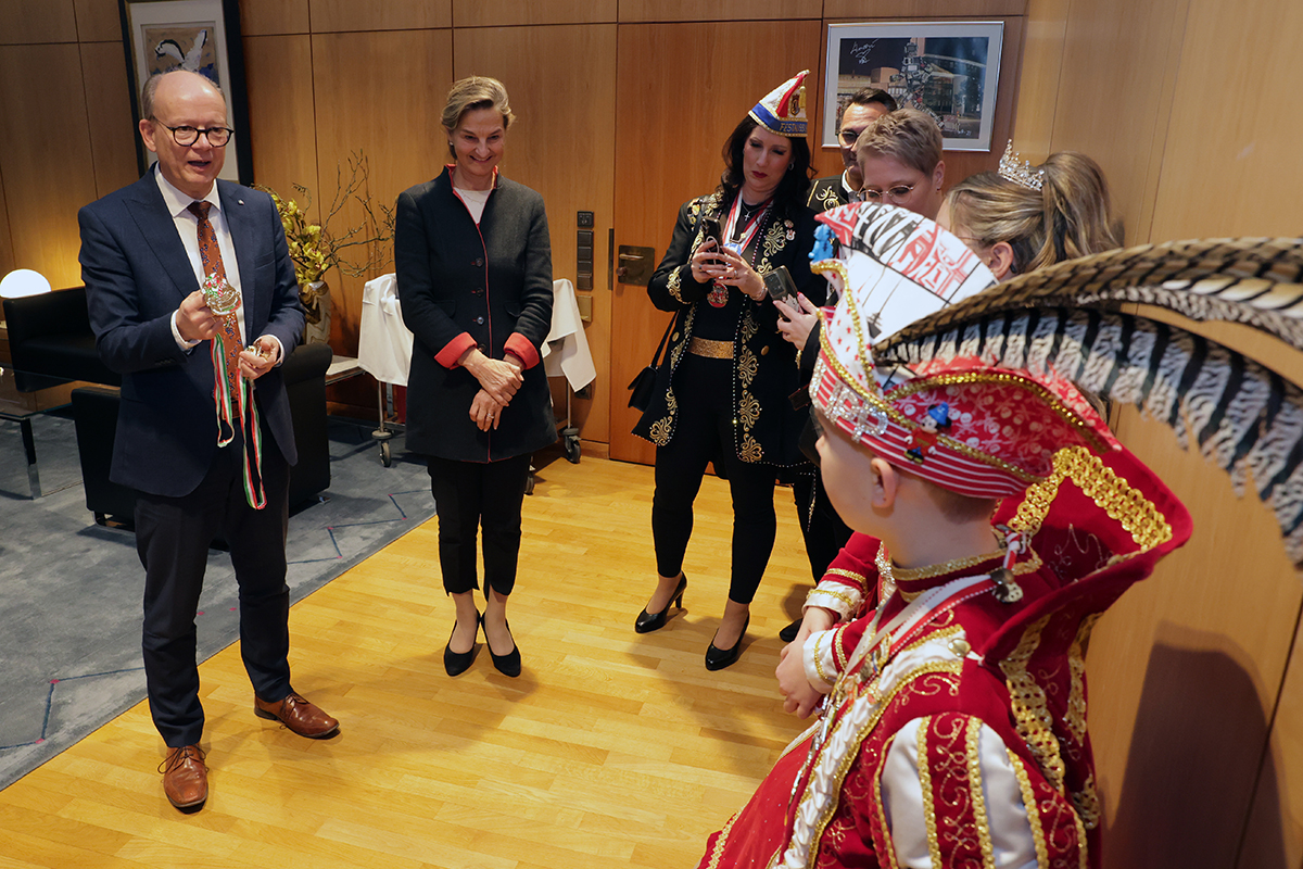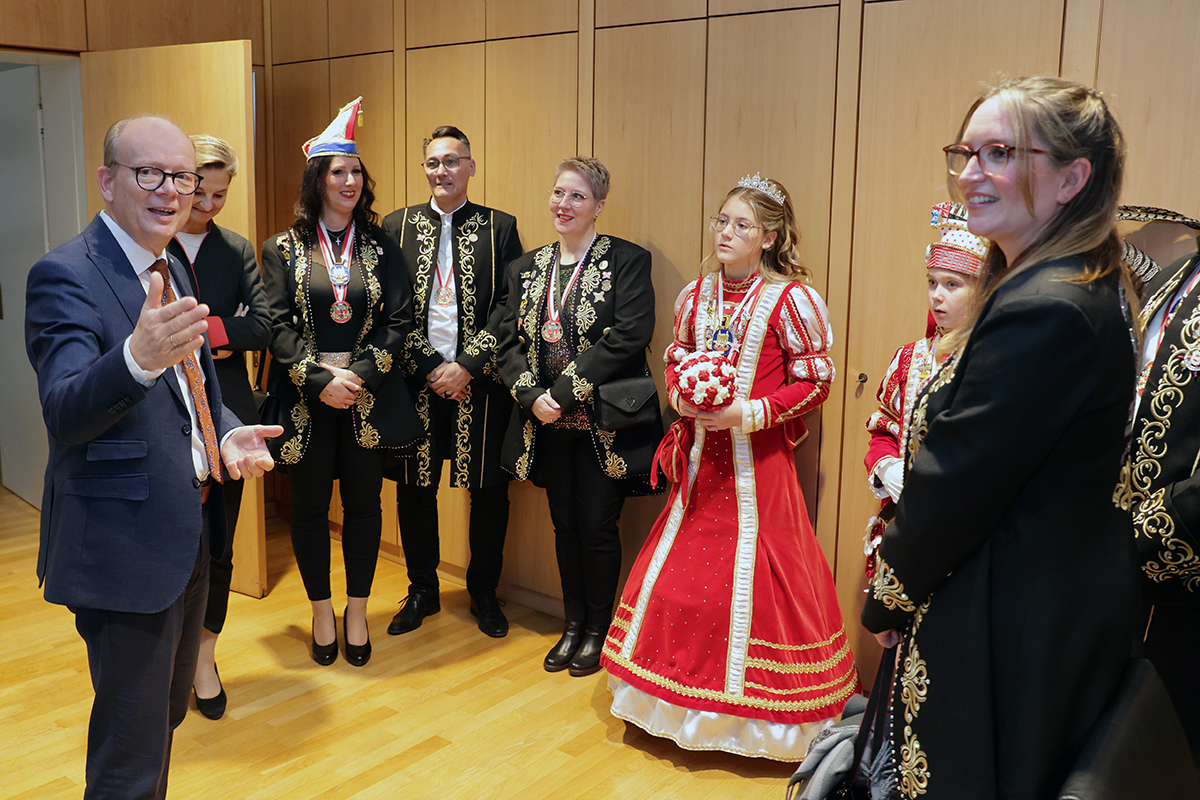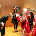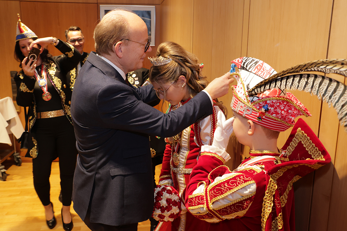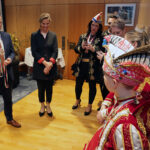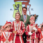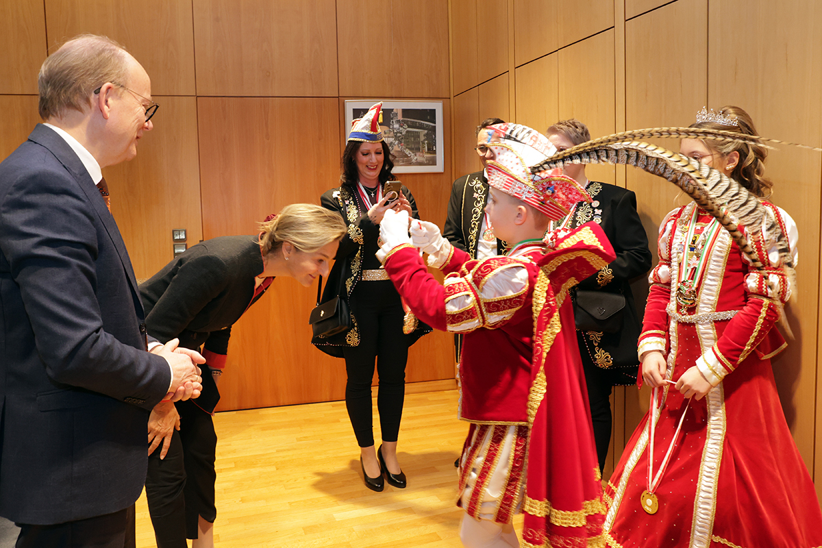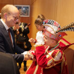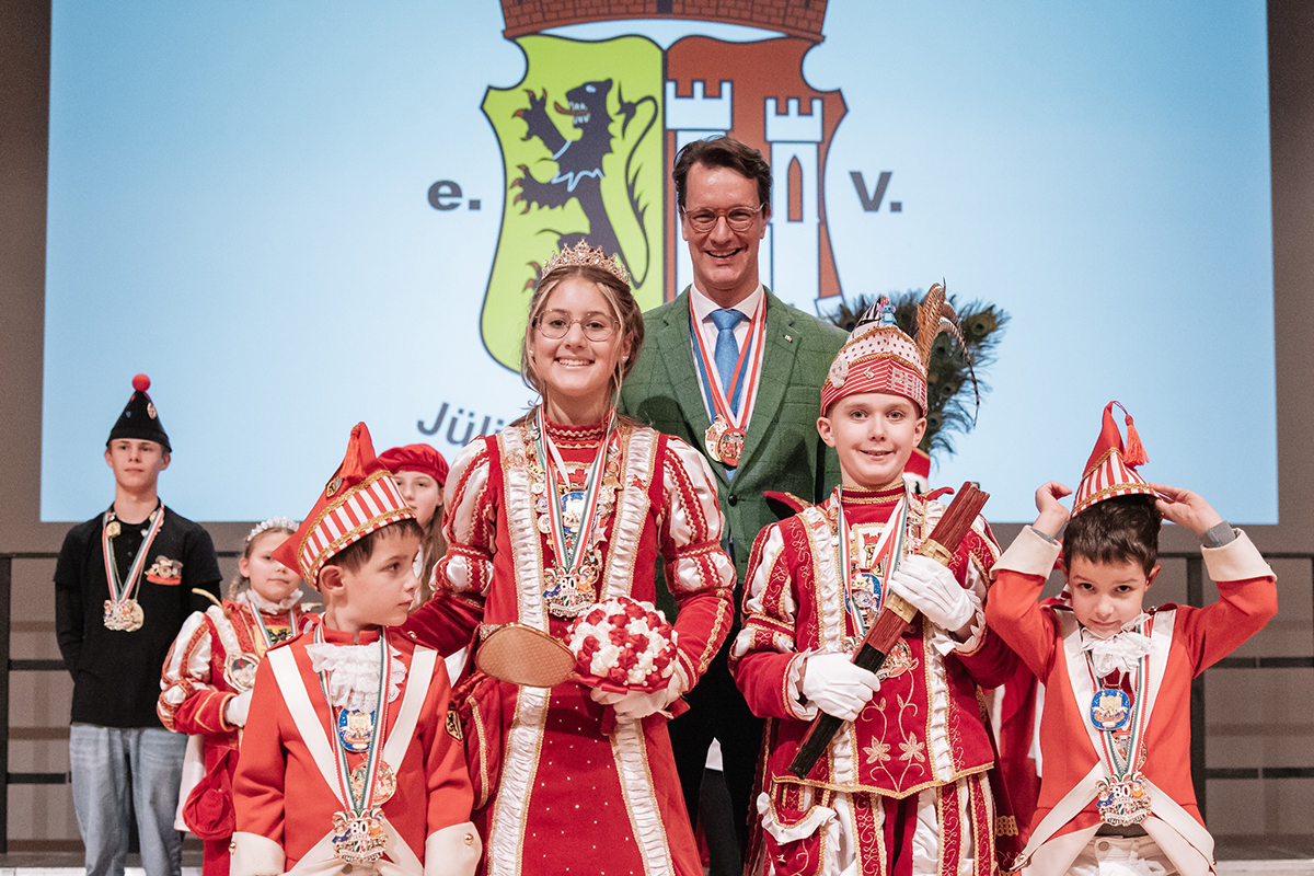Nur wenige Tage später stand bereits der nächste außergewöhnliche Termin an: der Empfang des Ministerpräsidenten von Nordrhein-Westfalen, Hendrik Wüst. Diesmal, auch gemeinsam mit ihren Pagen, den Zwillingen Ben und Felix Schröder, machte sich das Kinderprinzenpaar auf den Weg ins Kulturzentrum Rheinkamp in Moers, wo die Veranstaltung stattfand. Der Empfang ist speziell für Kinder- und Jugendtollitäten aus ganz NRW konzipiert. Zahlreiche Kinderprinzenpaare, Dreigestirne und Prinzessinnen waren eingeladen. In Gruppen betraten die Tollitäten über einen roten Teppich die Bühne, erhielten ihren Orden vom Ministerpräsidenten und tauschten anschließend Erinnerungsorden untereinander. Für Prinz Philipp blieb dabei eine Begegnung besonders in Erinnerung: ein kurzes Spiel „Schnick, Schnack, Schnuck“ mit dem Ministerpräsidenten – selbstverständlich mit einem Sieg für den Jülicher Prinzen.