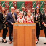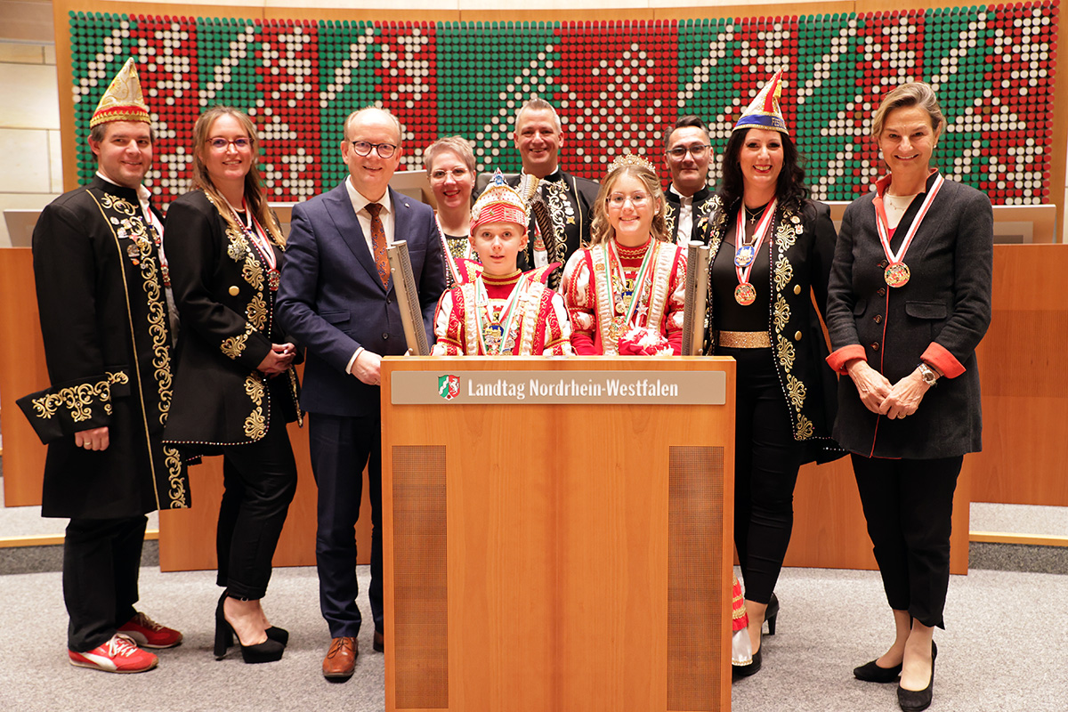 Ein ganz besonderer Höhepunkt der Session für das Prinzenpaar war der Besuch in Düsseldorf – und zwar nicht irgendwo, sondern im Landtag. Dort erhielten die beiden eine exklusive private Führung durch das beeindruckende Parlamentsgebäude. Dr. Patricia Peill, Abgeordnete im Nordkreis Düren-Jülich, übernahm die Führung und geleitete die Gruppe durch den Landtag. Dabei gewährte sie spannende Einblicke in die parlamentarische Arbeit und erläuterte anschaulich die Abläufe im politischen Alltag. Im Rahmen des Besuchs erhielten Prinz und Prinzessin die Gelegenheit, das Plenum zu betreten und hinter das Rednerpult treten zu dürfen. Im Anschluss folgte sogar noch eine persönliche Begegnung mit dem Präsidenten des NRW-Landtages, André Kuper. In diesem Rahmen wurde dem Prinzenpaar als besondere Auszeichnung ein Orden des Landtages überreicht.
