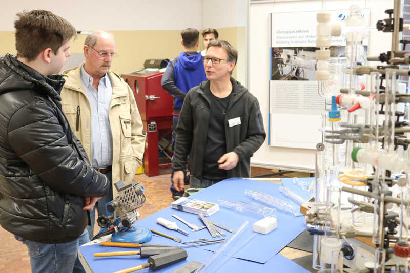 Auch seltene Berufe sind im Repertoire. Einen einzelnen Glasapparatebauer sucht gerade Andreas Schwaitzer. „Ein rein manueller Beruf, der handwerkliches Geschick und den Umgang mit der Flamme verlangt.“ Gefertigt werden die Glasgeräte entweder als Einzelstück oder als Kleinstserie. Das bedeutet Abwechslung. „In NRW wird dieser Beruf weit unter der Bedarfsgrenze ausgebildet“, prognostizierte Schwaitzer gute Zukunftschancen und weiter: „Gerne kann vor der Ausbildung innerhalb eines Praktikums in den Beruf reingeschnuppert werden.“