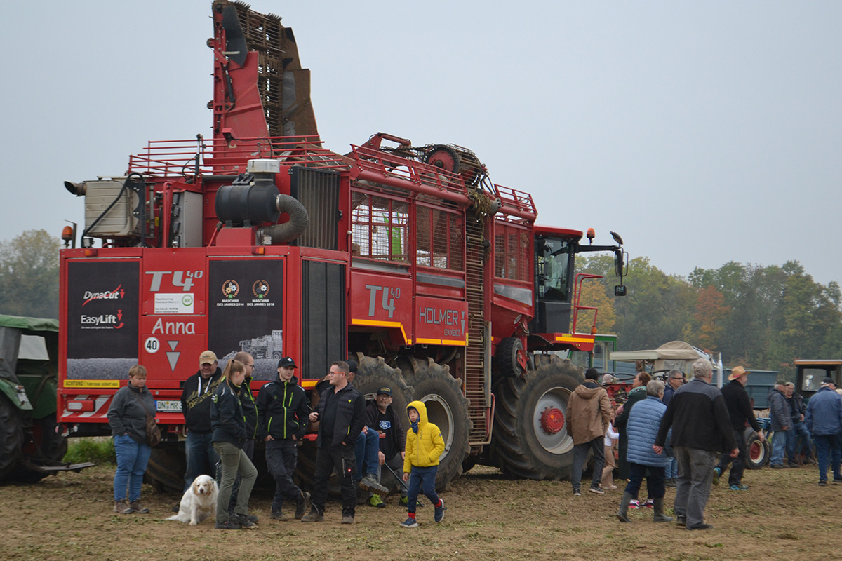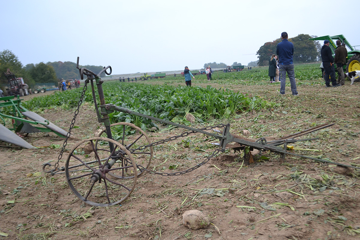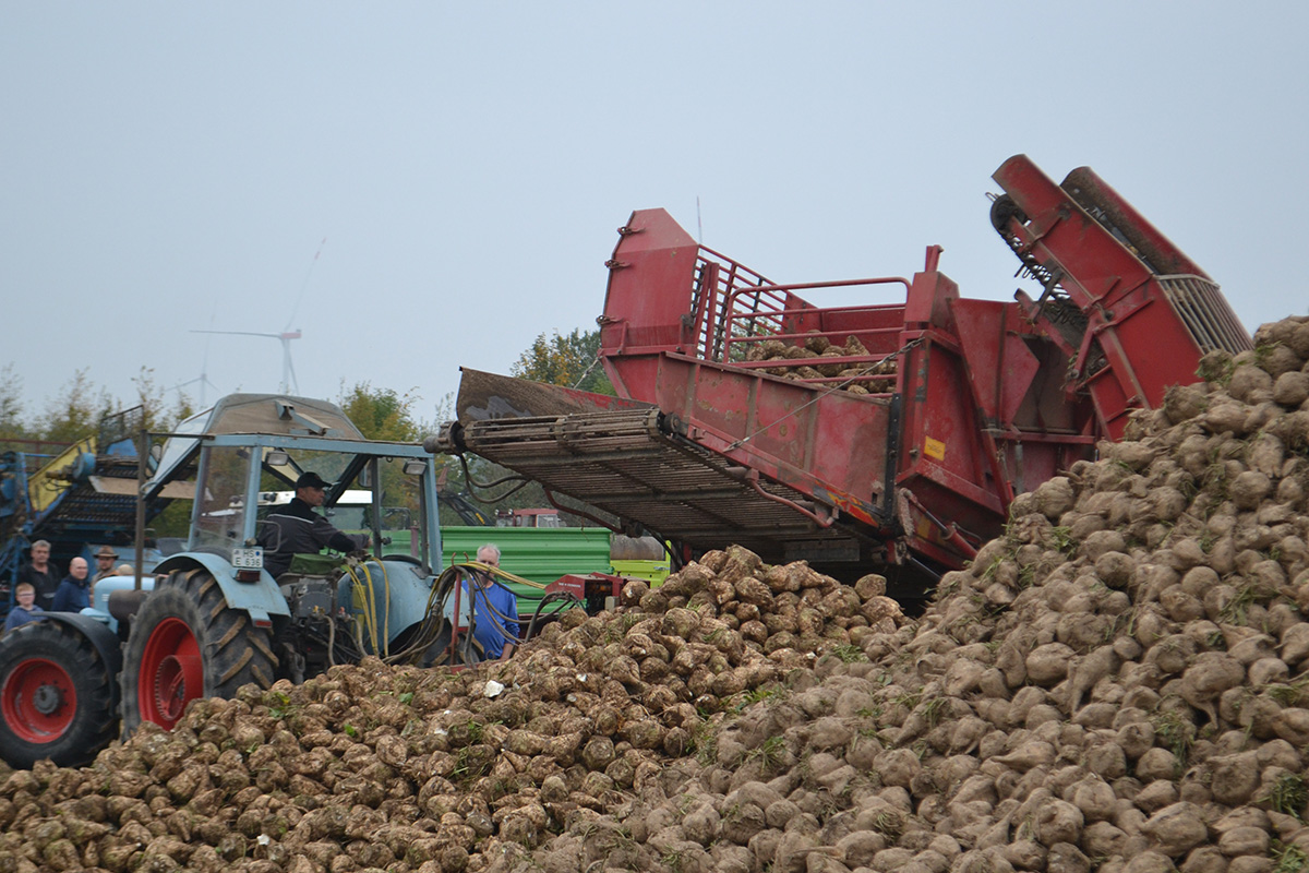 Hier standen Grabegabeln, an Pflugmaschinen erinnerndes Gerät und laut vor sich hin tuckernde Traktoren bereit und warteten auf fleißige Erntehelfer. Auf Anregung des bekennenden Nostalgikers Sascha Jussen, der zumindest in Sachen Landmaschinen die Zeit gerne ein wenig zurückdrehen würde, gab es einen Querschnitt durch die Erntemethoden der letzten, geschätzt hundert Jahre zu sehen. Auch ein haushoher, sechsreihiger und selbstfahrender Rübenroder demonstrierte auf dem Acker von Bauer Johnen sein Können.