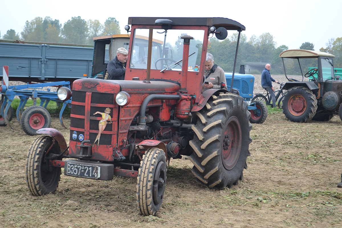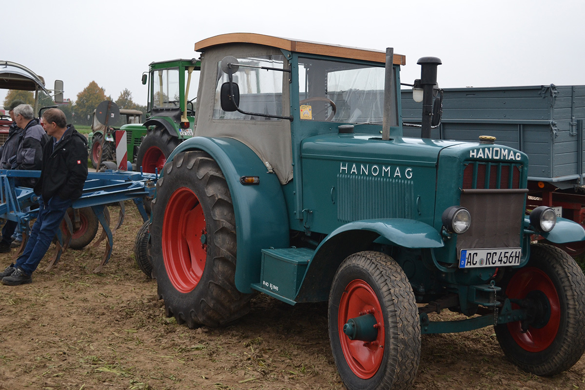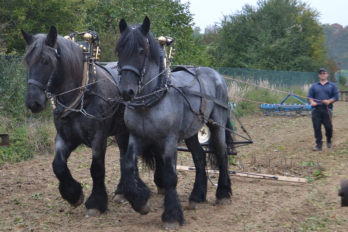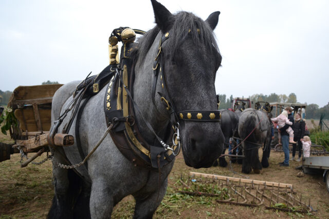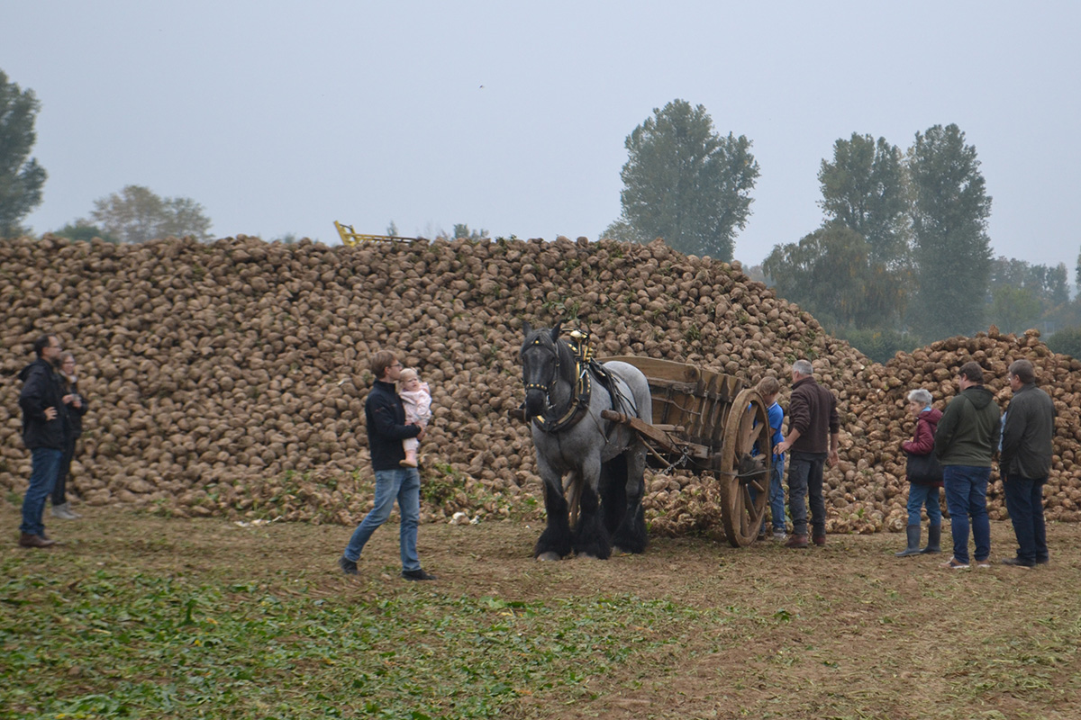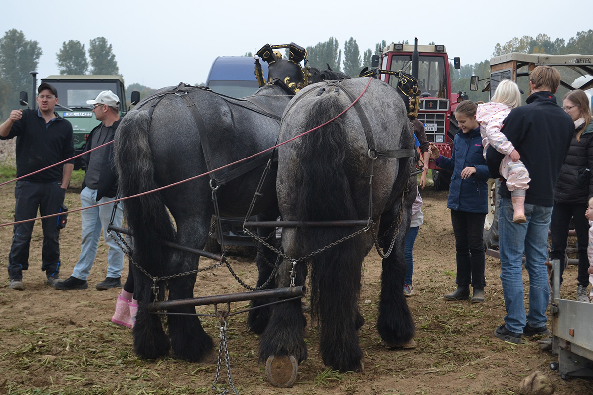 „Natürlich ist es nicht Aufgabe der Landwirte, unser Nostalgiebedürfnis zu befriedigen“, betont Jussen, der sich allerdings in guter Gesellschaft weiß, da doch viele „die alten Zeiten vermissen“ und dem Hobby „alte Landmaschinen“ frönen. Manchmal zusammengeschlossen in Vereinen, mancher auch einfach nur für sich selbst, werden Traktoren und anderes Gerät aus den 60er, 70er oder noch früheren Jahren gesammelt, gehegt und gepflegt. Und manchmal eben auch zu Demonstrationszwecken genutzt. Besonderes Highlight, vor allem für die jüngeren Besucher auf dem Rübenacker, waren zweifellos die schweren belgischen Kaltblüter, die eindrucksvoll zeigten, wie viel Zeit die Rübenernte früher kostete. Reihe um Reihe zog das Gespann von Thomas Wolf aus Mersch-Pattern geduldig die altmodische Erntemaschine durch die Rüben.