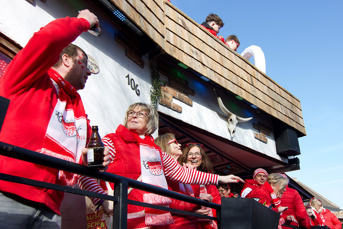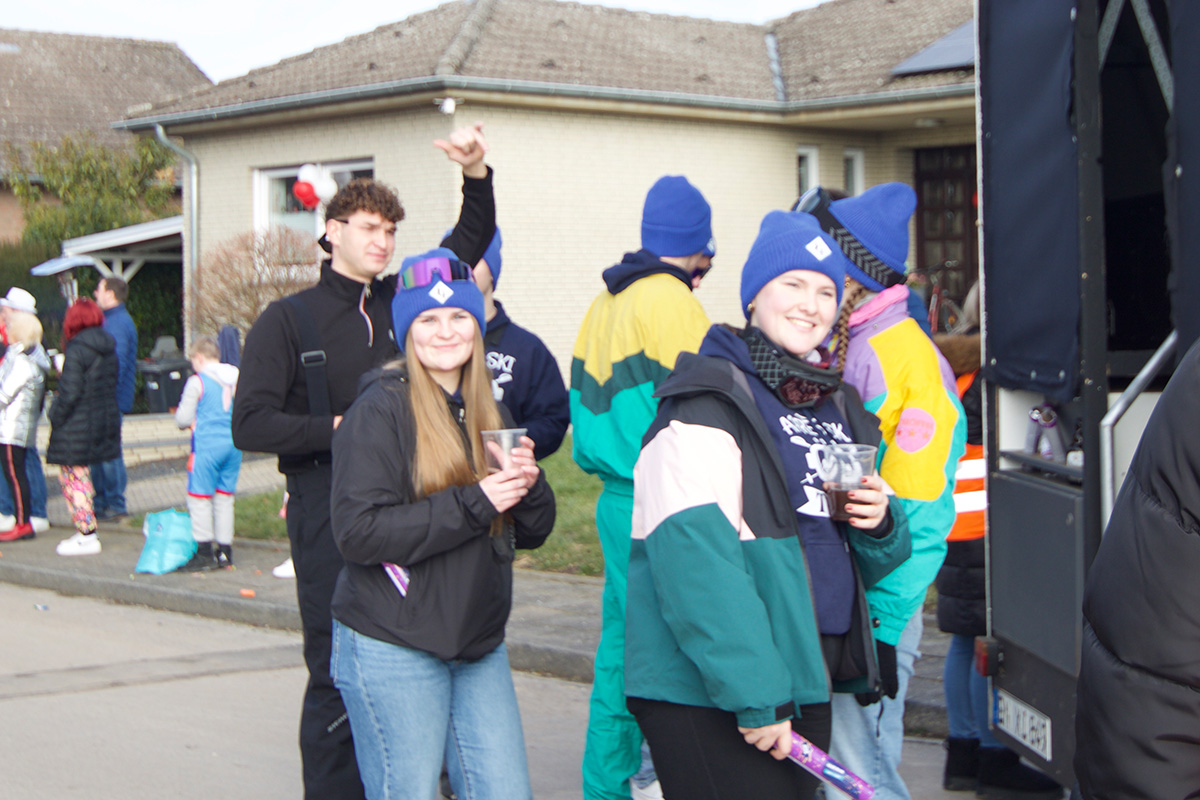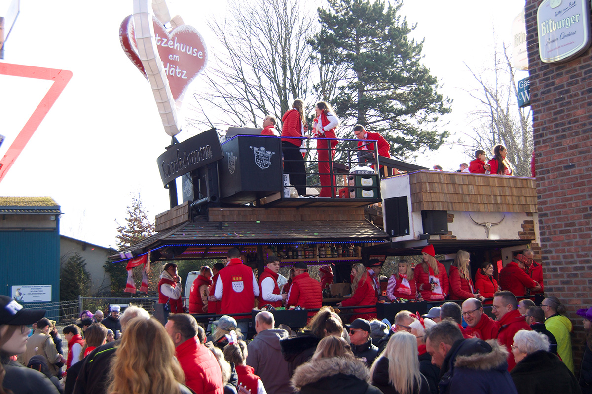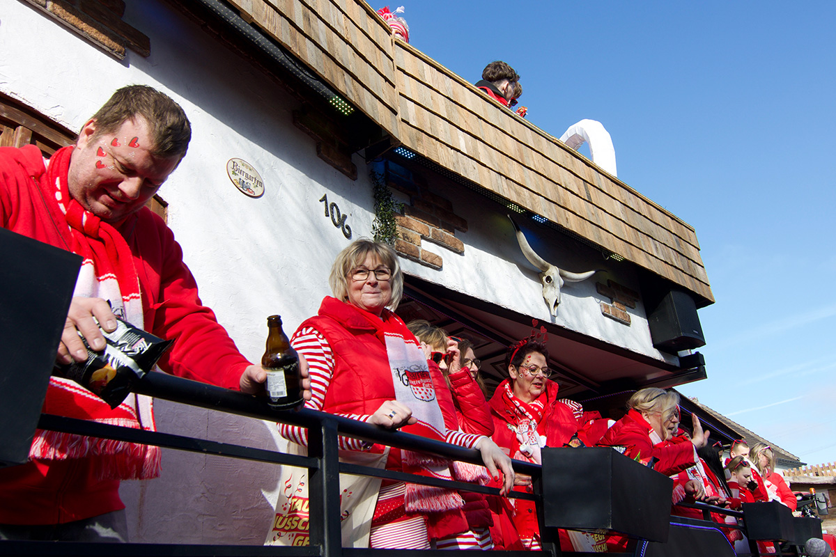 Was einst als „Vorspiel“ zum alljährlichen Straßenkarneval begann, hat sich längst etabliert und steht bei vielen Jecken ganz dick im närrischen Kalender. Ob am Straßenrand oder mittendrin im „Zoch“, so manch einer nimmt eine längere Anreise auf sich. Glücklich, wer zu Fuß oder mit dem Fahrrad kommen kann, denn Parkplätze rund um das kleine Dorf sind rar. Doch das störte hier niemanden: Bei strahlendem Sonnenschein und prächtiger Stimmung feierten, tanzten, schunkelten die bunt kostümierte Menge.