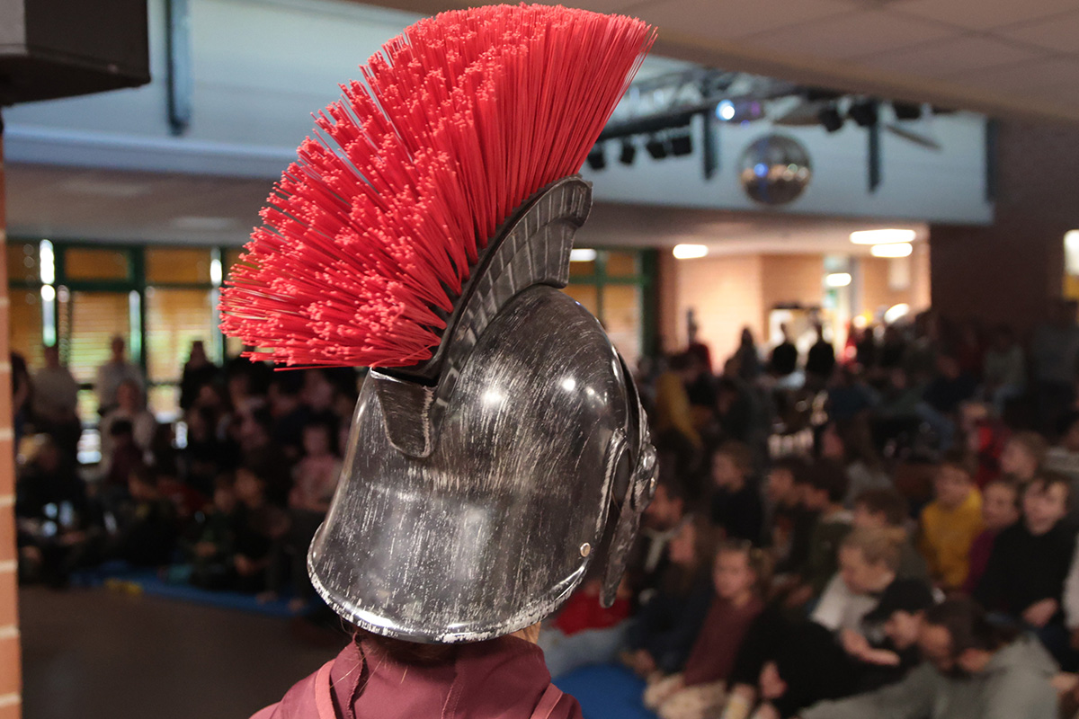 Schon am Nachmittag füllte sich die Schule mit gespannter Aufregung als sich die Schülerschaft im Pädagogischen Zentrum der Schule versammelte. Dort unterhielt zum Einstieg ein szenisches Spiel der Sankt-Martins-Geschichte das bunt leuchtende Publikum – mit musikalischer Begleitung, einem mutigen Martin und natürlich dem Bettler.