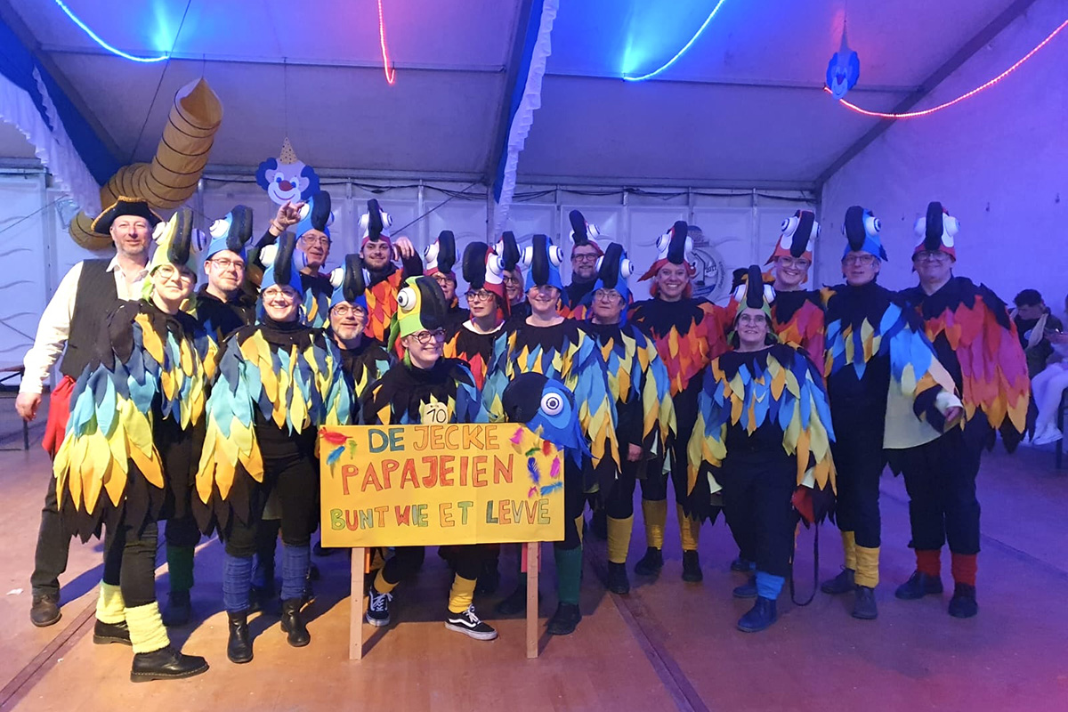 Den dritten Platz bei den Gruppenkostümen teilten sich die „DJ jeck attack“ und „De jecke Papajeien“, die beide zu den seit vielen Jahren teilnehmenden Gruppen zählen. Bei den beiden anderen Gruppen wurde erst nach der Siegerehrung deutlich, wer da gewonnen hatte, waren doch beide Gruppen vollkostümiert in sperrigen Kostümen und bis dahin geheimnisvoll verborgen.