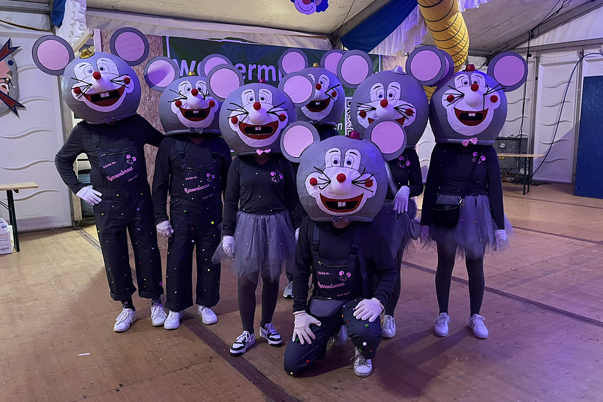 Platz 2 ging an die “Pfingsmäuse” genannten Karnevalsmäuse, die sichtlich froh waren, ihre übergroßen Pappmaché-Mausköpfe ausziehen zu können. Gruppenkostüm-Sieger wurden die “Kinderriegel und Milchgäser”, die ebenfalls erleichert aus ihren großen „Verpackungen“ kletterten.