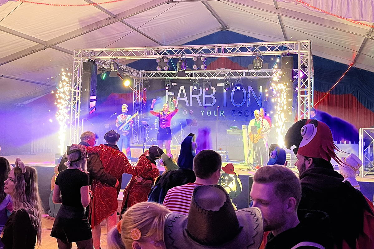 Rund um den Kostümwettbewerb sorgte zum zweiten Mal die Coverband FarbTon aus Grevenbroich für ausgelassene Stimmung und Tanzlaune mit ihrem Mix aus Karnevalsliedern, Party-Hits, Schlagern und Hits der letzten Jahrzehnte. Sie animierte das jecke Publikum zum Tanzen, Schunkeln und Mitsingen.