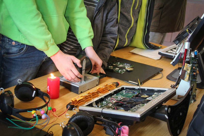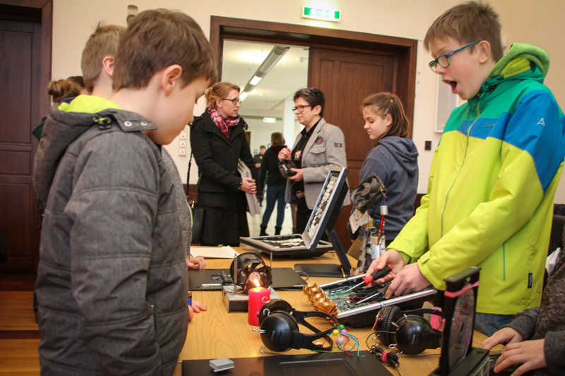 Ein einzigartiges Projekt hätte die Schirmerschule eingebracht, das sie so „auch noch nicht gesehen“ hätte, wobei jedes kleinste Teil eines PCs wieder verwendet würde und sei es als Kunstgegenstand, unterstrich Sarah Thießen. So machte sich die Schirmerschule Gedanken in ihrem Projekt „Ein zweites Leben für alte Computer“ darüber, was in Computern drinsteckt und sich noch nutzen lässt, wenn sie ausmustert werden. Die ganze Hardware wurde ausgebaut, damit wurden neue leistungsfähige Computer hergestellt, die beispielsweise im Physikunterricht genutzt werden. Aus dem, was sich nicht weiter verwenden ließ, entstanden kreative und praktische Dinge.