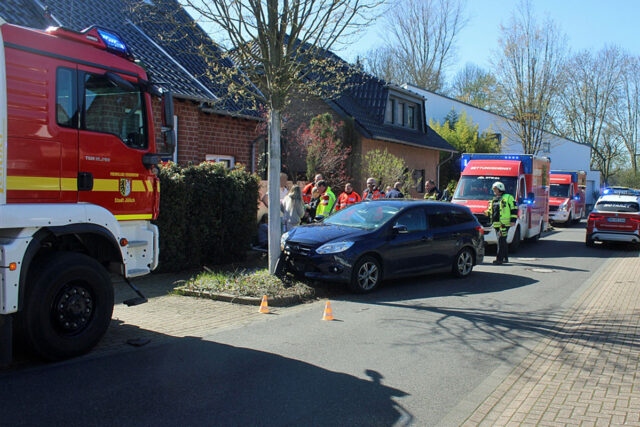 Eine 26-jährige Fahrerin aus Jülich fuhr am 1. April um 14.41 Uhr mit ihren zwei Kindern auf der Jülicher Hermann-Barnikol-Straße in Fahrtrichtung Victor-Gollancz-Straße, so die Polizei Düren. Die Kinder im Alter von ein und vier Jahren seien ordnungsgemäß in Kindersitzen auf der Rückbank gesichert gewesen. Nach Angaben der Fahrerin hatte eines der Kinder plötzlich während der Fahrt angefangen stark zu husten, so dass sie kurzzeitig abgelenkt war. Dadurch sei sie bei niedriger Geschwindigkeit nach rechts von der Fahrbahn abgekommen und frontal mit einem Baum kollidiert.
