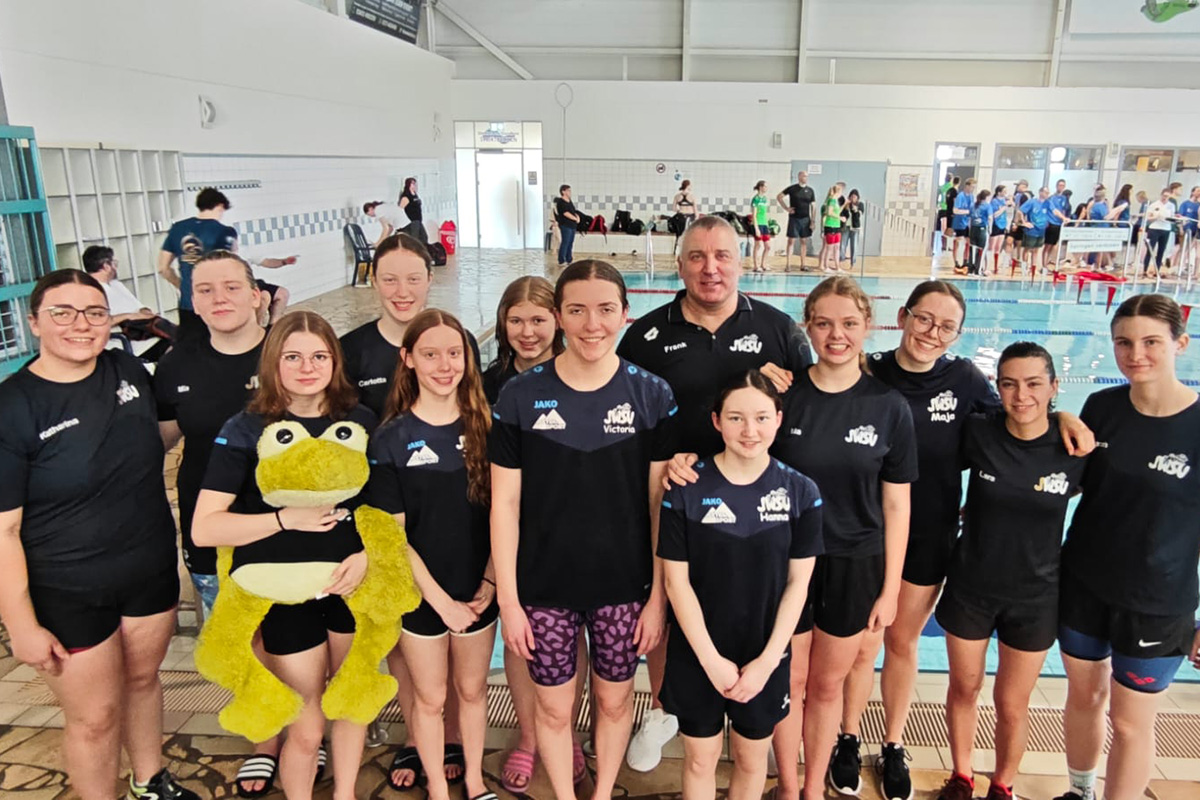 Neben dem Becken war die Stimmung von Anfang an von Spannung und auch von Nervosität geprägt. Spätestens als der Wettkampf schließlich begann war bei allen der Wettkampfmodus eingeschaltet. Im Becken haben die Damen alles gegeben und neben dem Becken hat das Team grandiose Unterstützung auch von der Jülicher Herrenmannschaft bekommen. Es wurde gekämpft, angefeuert und mitgezittert.