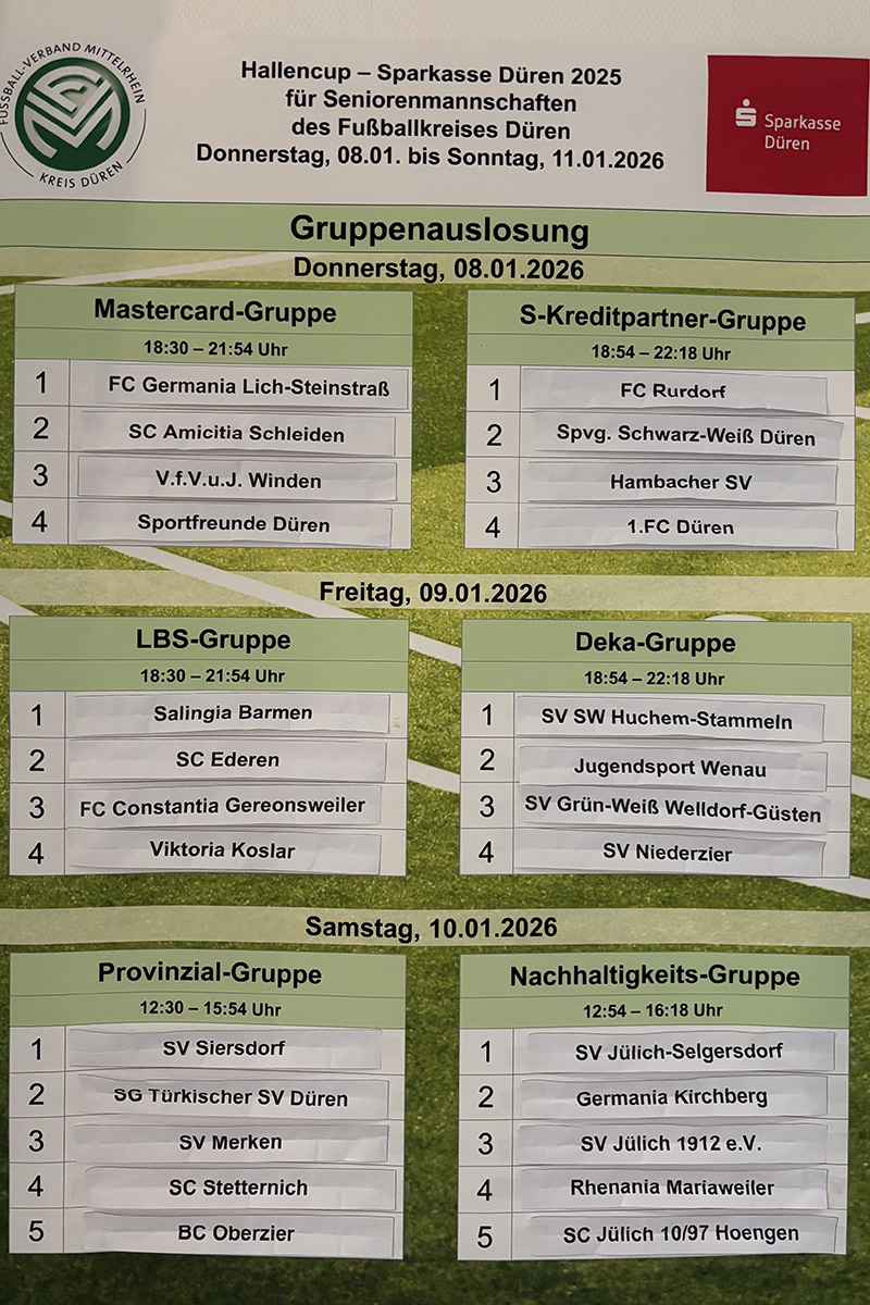 Die Auslosung des Hallencups ist abgeschlossen, alle Teams stehen fest. Insgesamt 26 Mannschaften nehmen teil. Die Vereine stammen aus allen Ligen des Fußballkreises Düren: von der Mittelrheinliga als höchster Spielklasse bis hin zur Kreisliga C. Gespielt wird in sechs Gruppen, die an den einzelnen Turniertagen um den Einzug in die Finalrunde kämpfen. Wie schon in den vergangenen beiden Jahren gelten auch diesmal die FIFA-Futsal-Regeln.