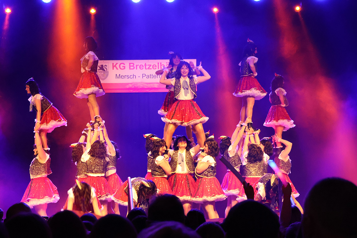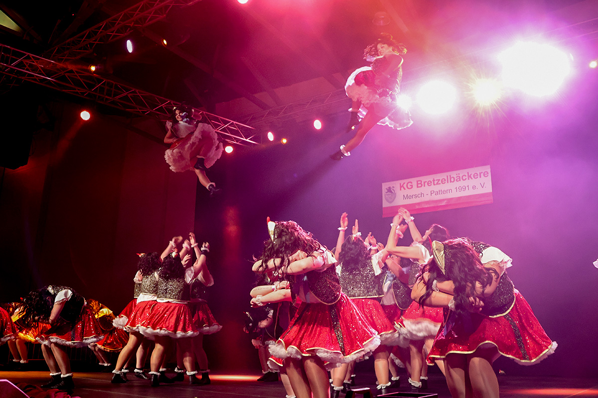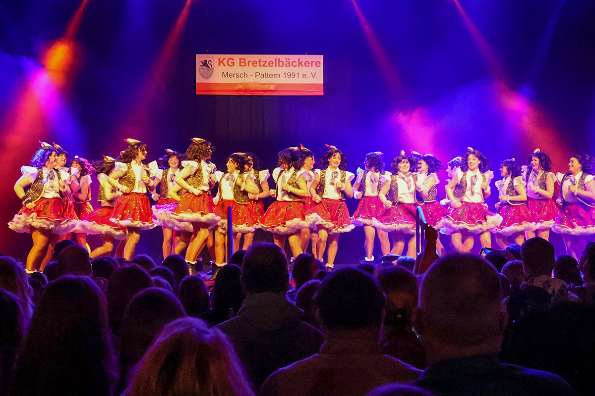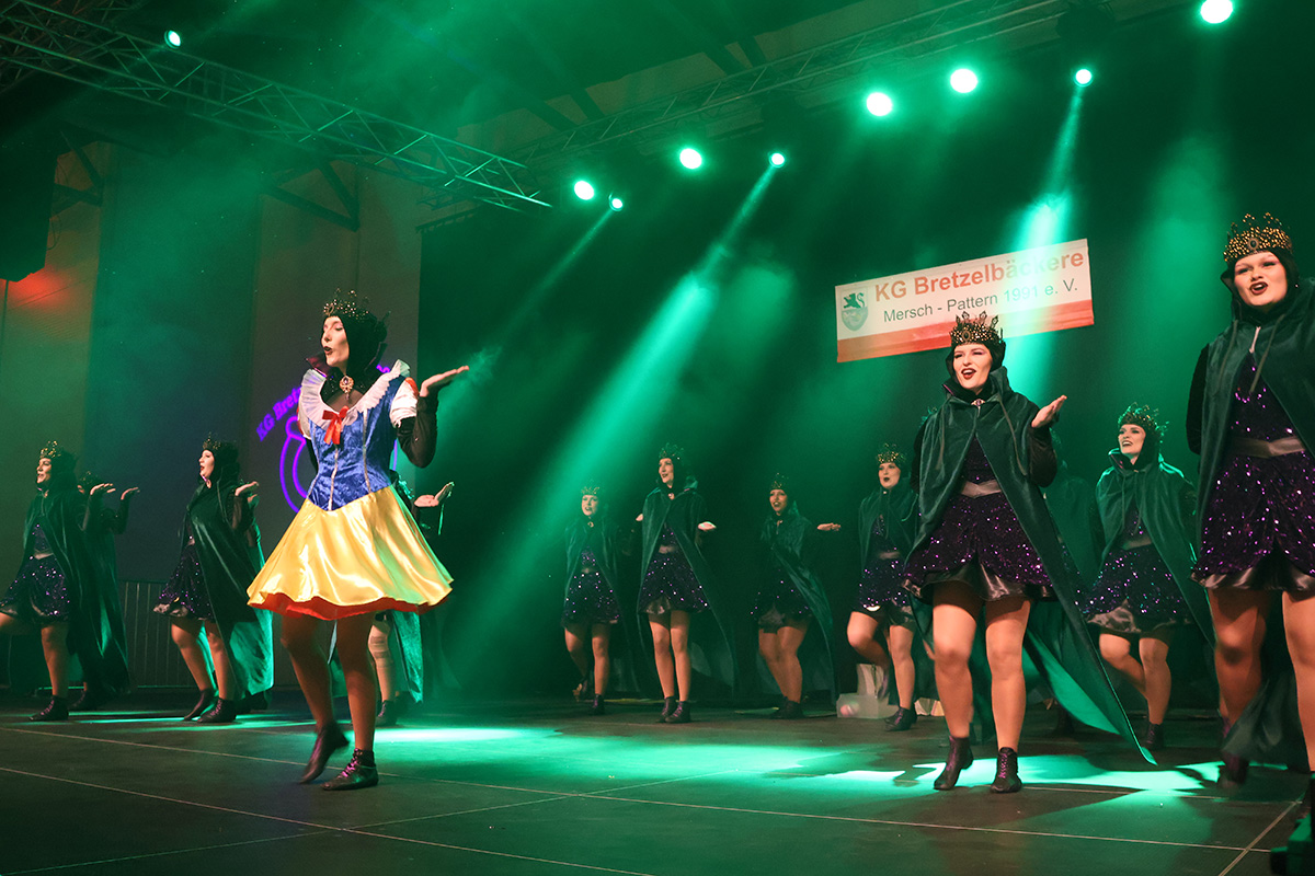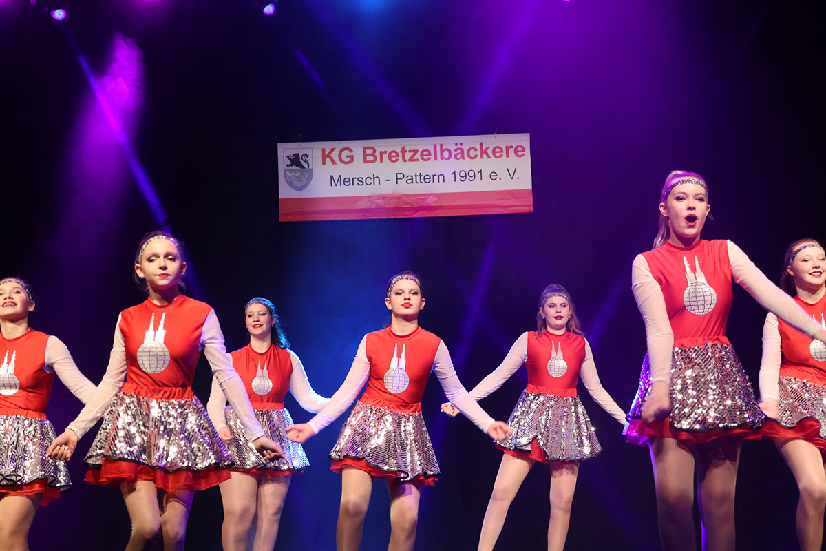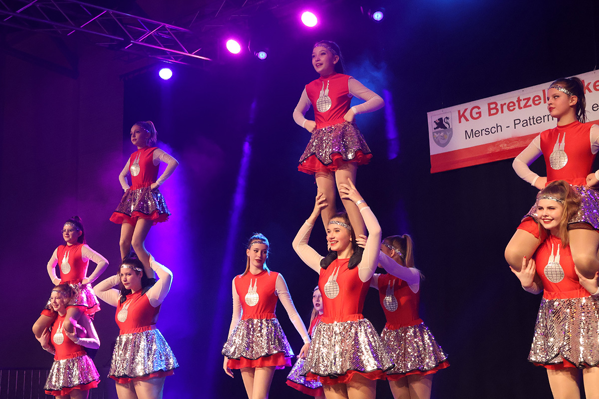Mitreißende Choreografien, aufwendige Kostüme und eine volle Muschel. Etwa 900 Menschen kamen laut Pressewart am letzten Freitag in der Muschel zusammen, um karnevalistisch dem Tanz und der Musik zu huldigen. Tanzgruppen aus der ganzen Region wetteiferten zum vierten Mal in der Kulturmuschel im Jülicher Brückenkopf-Park um das Wohlwollen der Jury und den Wanderpokal der KG Bretzelbäckere. Moderiert wurde der Abend von Jan Schiffer, Präsident der Mersch-Patterner Karnevalsgesellschaft. Insgesamt waren elf Showtanzgruppen gemeldet, die ihre Startreihenfolge zu Beginn des Abends gemeinsam auslosten. Krankheitsbedingt musste die Penelopecrew von der KG Maiblömche aus Lich Steinstraß absagen, ebenso die Starlights, die als Eisbrecher angekündigt waren. Die Moonlights, bestehend aus den elf bis sechzehnjährigen Tänzerinnen der Gastgeber, sorgten jedoch für einen gelungenen Auftakt.